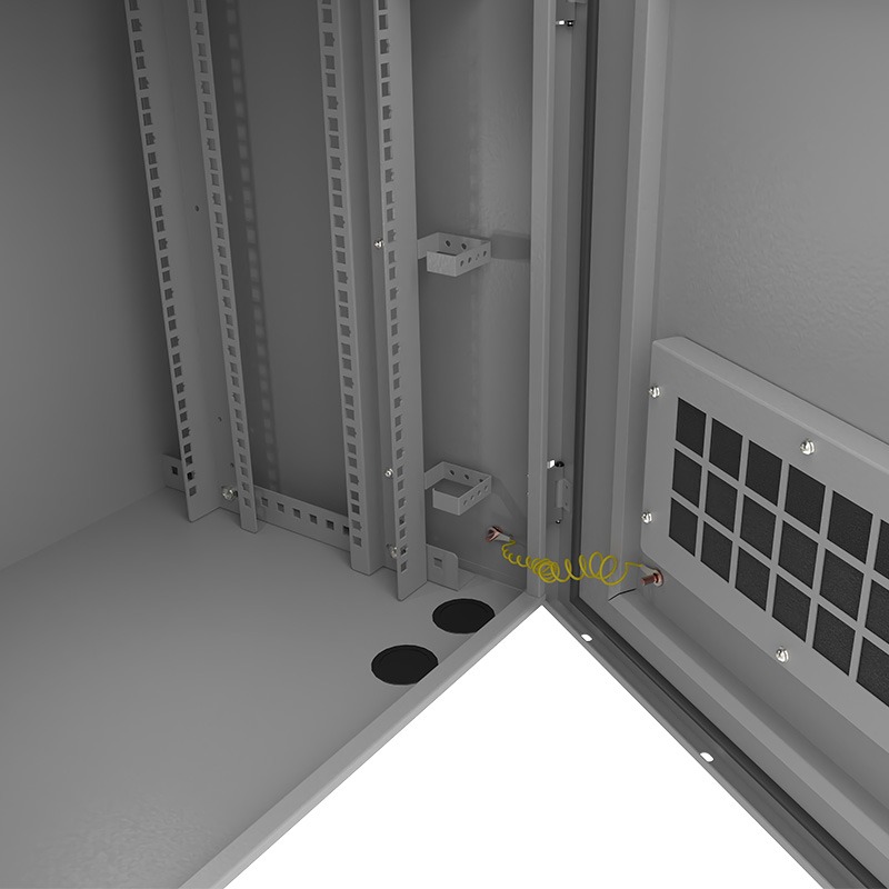Además, incorpora ventilación activa mediante dos ventiladores con termostato integrado, complementada por ventilación pasiva en puertas perforadas, lo que permite una adecuada disipación térmica.
