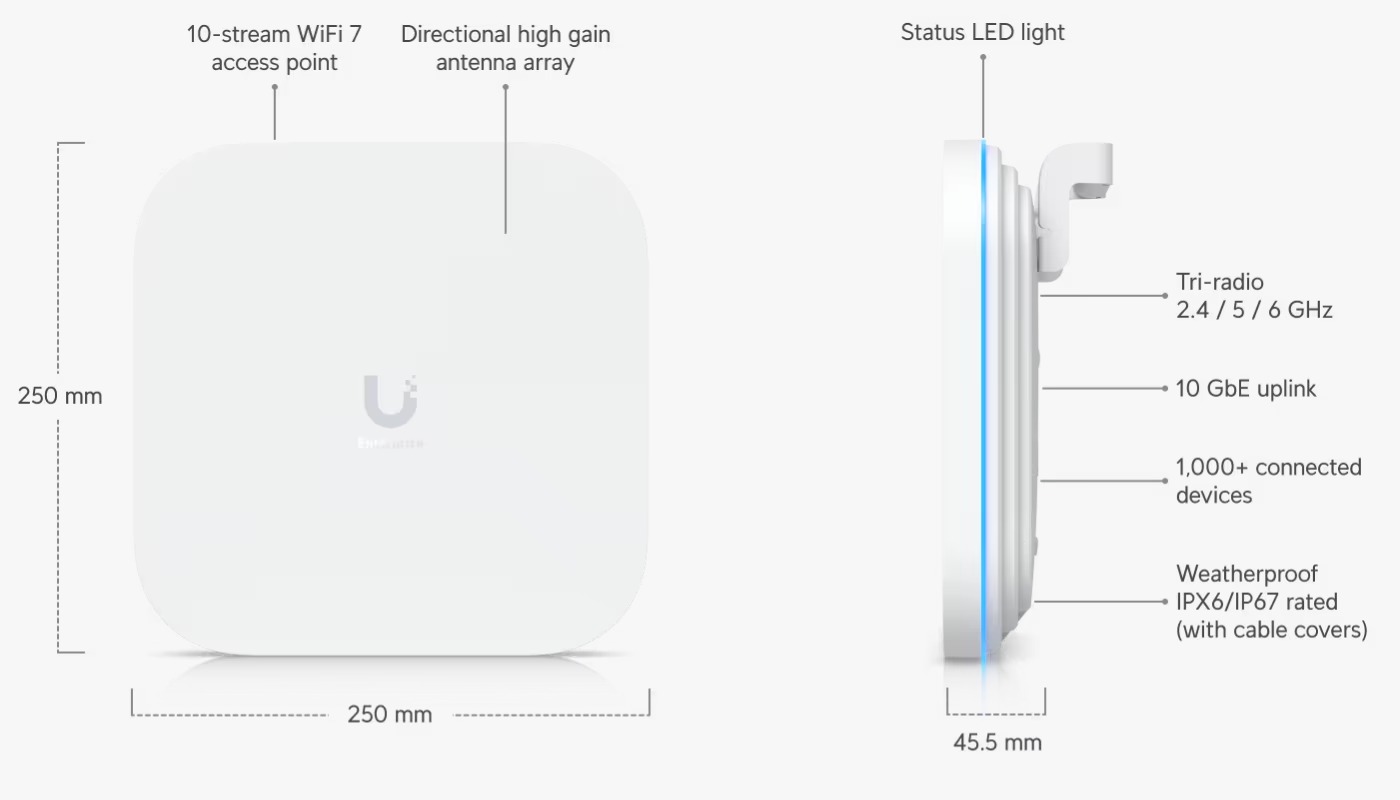 Equipado con 10 flujos espaciales MIMO, el E7-Campus ofrece velocidades asombrosas de hasta 11.5 Gbps en 6 GHz, 8.6 Gbps en 5 GHz y 688 Mbps en 2.4 GHz, utilizando un ancho de banda de hasta 320 MHz y modulación 4096-QAM. Esto permite una experiencia fluida incluso en redes con alta demanda, como streaming 8K, IoT industrial y videoconferencias masivas.