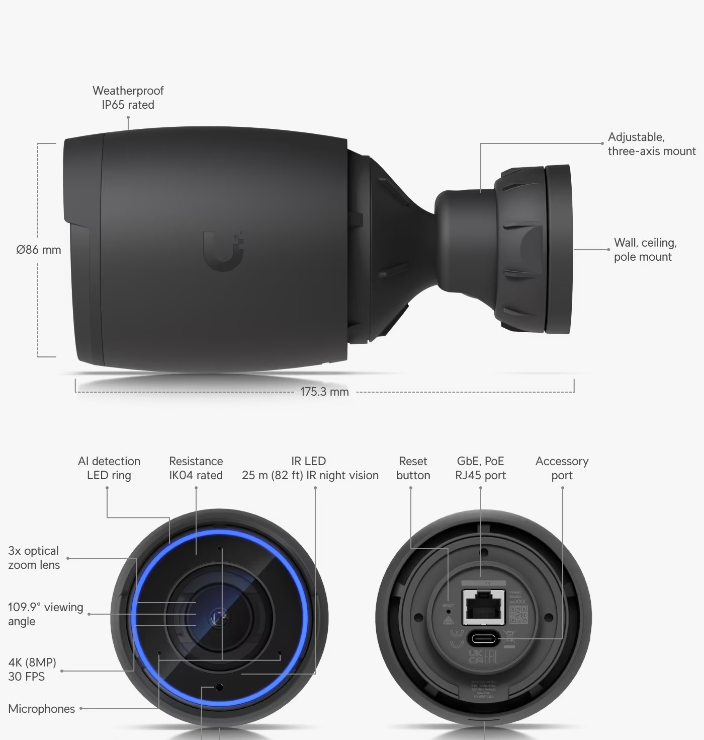 La Ubiquiti UniFi Protect UVC-AI-Pro es una cámara de videovigilancia profesional 4K diseñada para ofrecer seguridad avanzada y un monitoreo confiable en cualquier entorno. Su potente sensor de 8 MP (3840 × 2160, 16:9), combinado con óptica de alta calidad (lente F 4,1–12,3 mm con apertura de ƒ/1,53–ƒ/3,3), proporciona imágenes nítidas y detalladas incluso en condiciones de poca luz.
